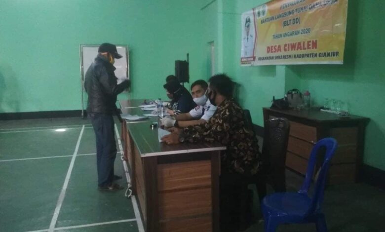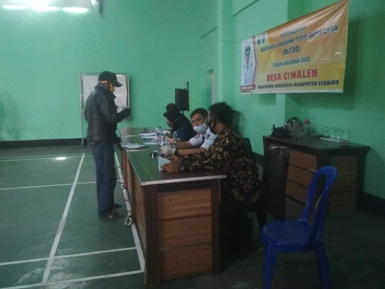 Sekertaris Desa (Sekdes) Ciwalen Kecamatan Sukaresmi, Deden Lukman, menyerahkan langsung BLT Dana Desa sebesar Rp 600 ribu per bulan itu kepada warga yang berhak. Kegiatan berlangsung di Aula Desa Ciwalen pada Kamis (9/7/2020).