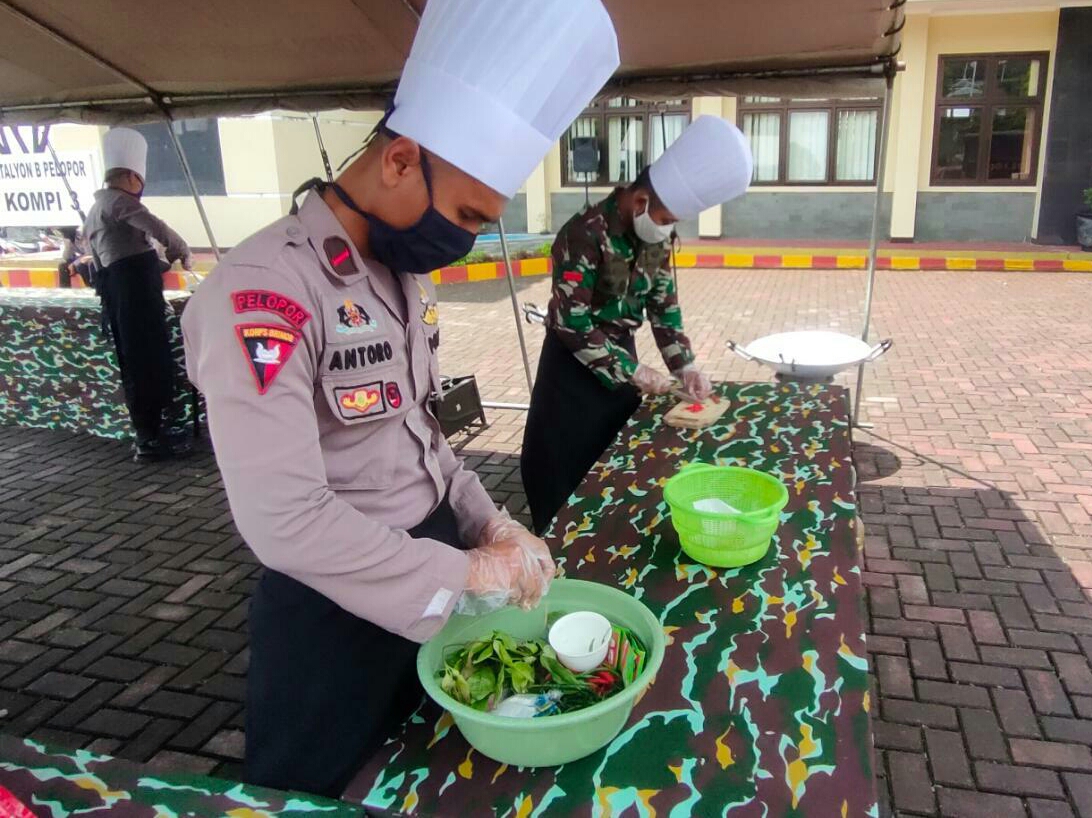 CIANJURUPDATE.COM, Cipanas – Aparat TNI/Polri berkolaborasi membangun dapur umum di Mako Brimob Cipanas, Minggu (19/4/2020). Kegiatan ini diawali dengan apel gabungan TNI-Polri dalam rangka Bhakti Brimob Untuk Masyarakat.