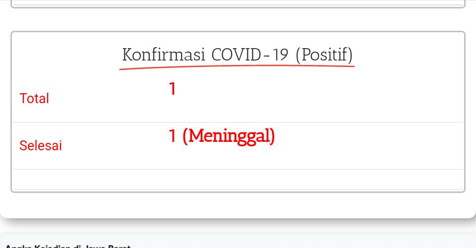 Hal serupa juga ditampilkan di situs https://pikobar.jabarprov.go.id/. Ada satu orang yang dinyatakan positif Corona atau Covid-19 di Kabupaten Cianjur.