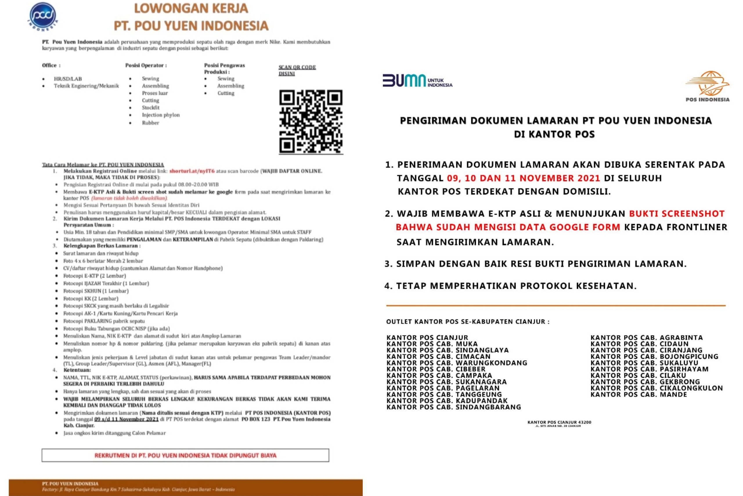 - Mengirimkan dokumen lamaran (nama ditulis sesuai KTP) melalui PT POS Indonesia (Kantor Pos) pada 9-11 November 2021 di PT POS terdekat dengan alamat PO BOX 123 PT Pou Yuen Indonesia Kab. Cianjur