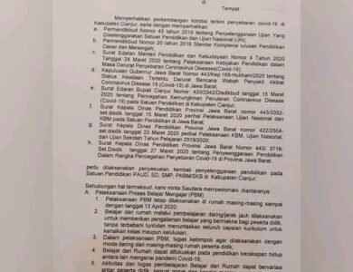 CIANJURUPDATE.COM, Cianjur – Proses Belajar Mengajar (PBM) di rumah masing-masing resmi diperpanjang sampai Senin, (13/04/2020) mendatang. Keputusan itu termuat dalam…