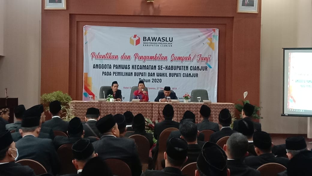 CIANJURUPDATE.COM, Pacet – Badan Pemgawas Pemilu (Bawaslu) Kabupaten Cianjur menggelar pelantikan dan pengambilan sumpah janji Anggota Panitia Pengawas Kecamatan (Panwascam) di Hotel Sangga Buana, Kecamatan Pacet, Jumat (27/12/2019). Mereka akan bertugas pada pemilihan Bupati dan Wakil Bupati Cianjur tahun 2020 mendatang.