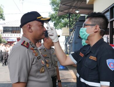 Cegah Corona, Polres Cianjur Cek Suhu Tubuh dan Semprot Disinfektan