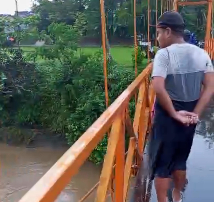 Pantauan di lokasi kejadian memperlihatkan warga memadati jembatan gantung berwarna oranye yang melintasi Sungai Cijampang untuk memantau proses pencarian. Arus sungai terlihat cukup deras dengan warna air yang keruh.