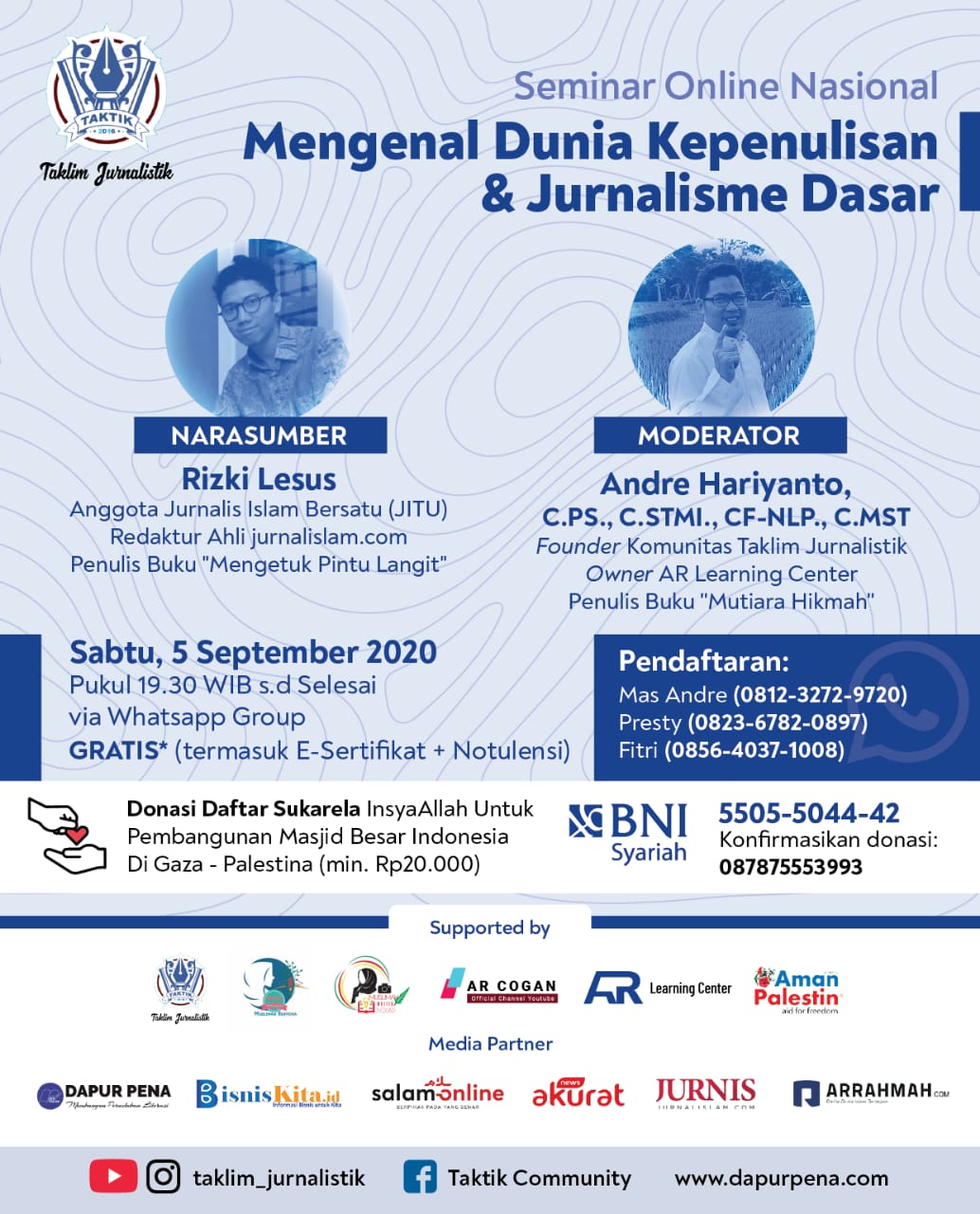 Dalam acara ini, panitia mengajak peserta untuk berdonasi dalam membantu pembangunan Masjid Indonesia di Gaza, Palestina yang didesain Ridwan Kamil, Gubernur Jawa Barat. Riski Lesus yang berperan sebagai pemateri tunggal dalam acara seminal online ini menyampaikan, ihwal membaca, menulis, pena, berpikir, merupakan istilah yang sering didengar dalam Al Qur’an. Bahkan, perintah pertama adalah membaca dikatannya dalam peserta yang antusias menyimak.
