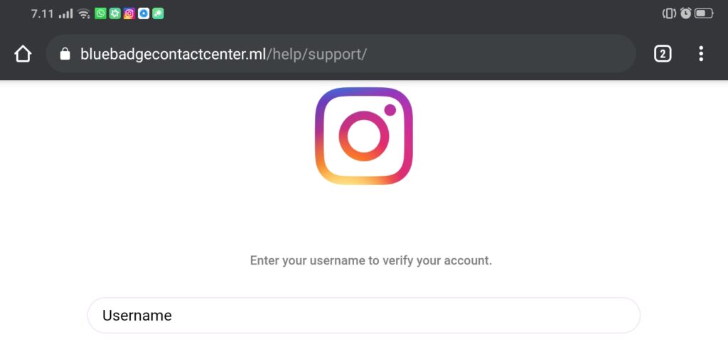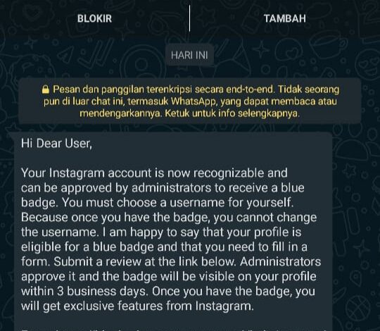 CIANJURUPDATE.COM, Cianjur – Beredar pesan WhatsApp berbau penipuan yang mengatasnamakan Instagram yang bermodus verifikasi akun dengan cepat melalui https://bluebadgecontactcenter.ml/help/support/ .Pesan tersebut diduga kuat berupa penipuan karena link yang diberikan tidak merujuk kenl laman resmi Instagram.