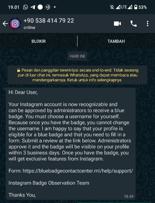 CIANJURUPDATE.COM, Cianjur – Beredar pesan WhatsApp berbau penipuan yang mengatasnamakan Instagram yang bermodus verifikasi akun dengan cepat melalui https://bluebadgecontactcenter.ml/help/support/ .Pesan tersebut diduga kuat berupa penipuan karena link yang diberikan tidak merujuk kenl laman resmi Instagram.