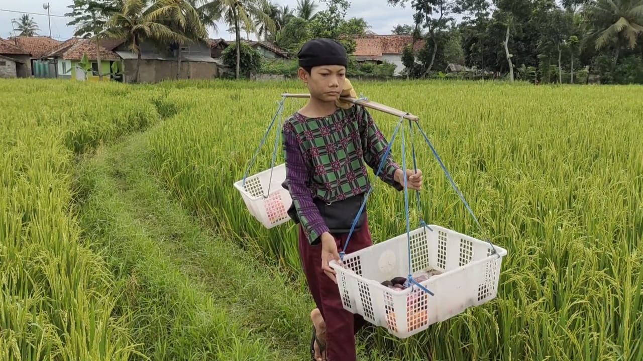 Setiap hari, setelah membantu sang kakak membersihkan rumah, Bayu berangkat memikul dagangannya dari satu kampung ke kampung lainnya.