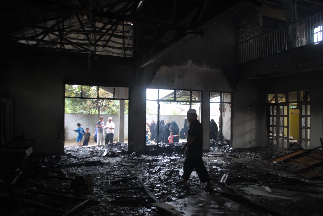 Percikan api muncul di lantai dasar dan pertama kali di lihat oleh salah seorang santri yang tengah makan di lantai atas masjid. Panik, para santri yang berjumlah sekitar 20 orang itu langsung berlarian ke luar masjid.