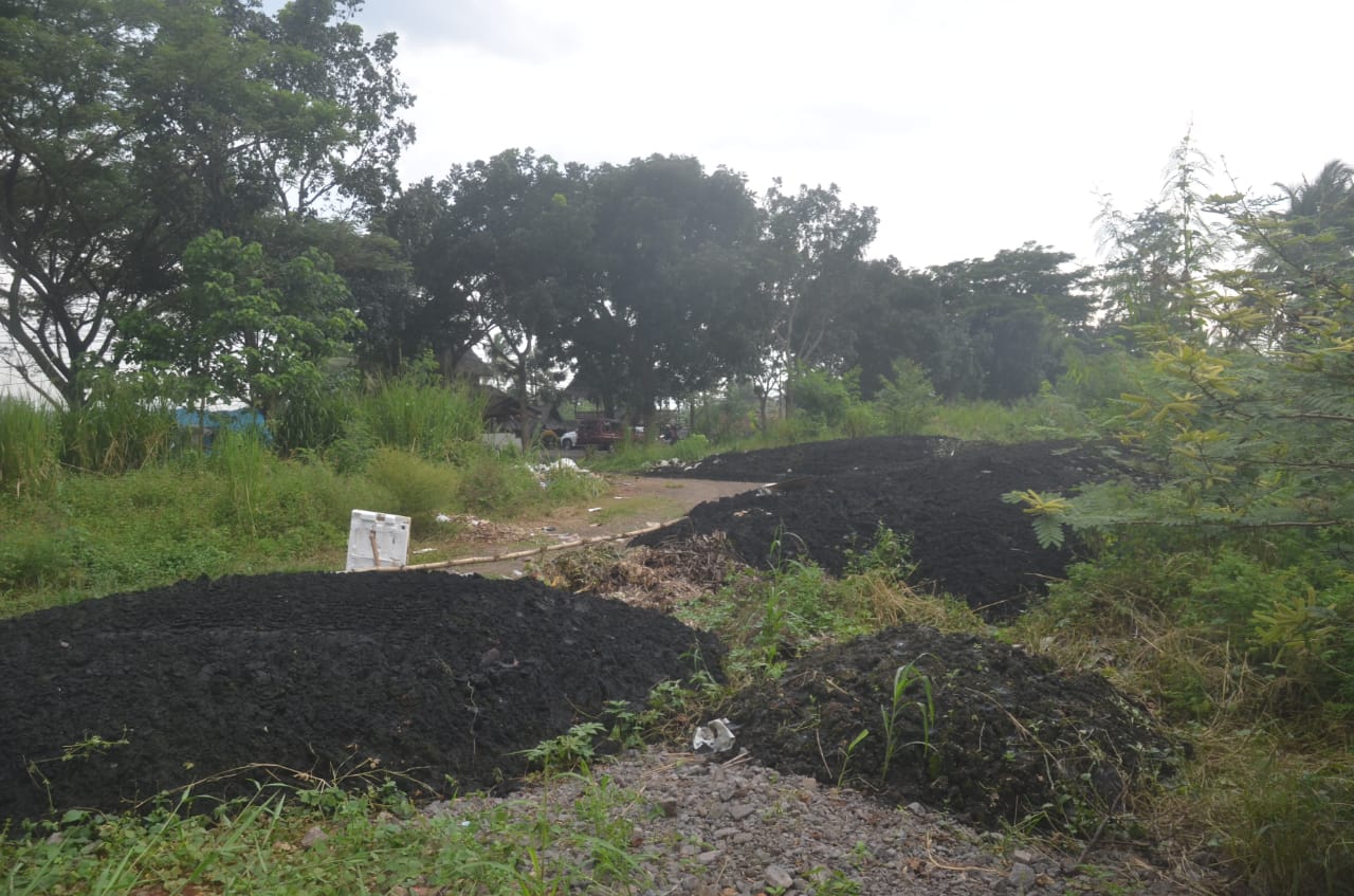 Kurang lebih empat tumpukan seperti pasir berwarna hitam dibiarkan begitu saja. Tak ada yang menyadari keberadaan limbah tersebut, meskipun berada di pinggir jalan raya.