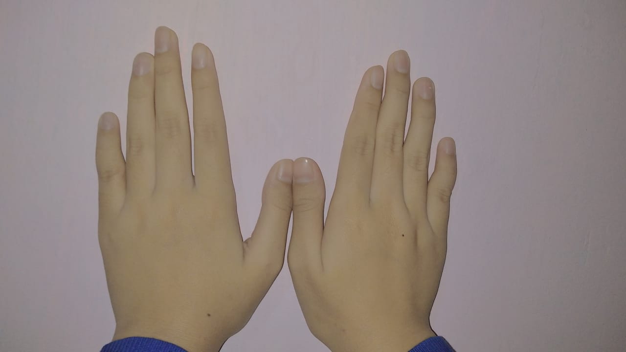 - Langkah selanjutnya adalah menempelkan telapak tangan kiri pada punggung tangan kanan, hingga ujung-ujung jari dari salah satu tangan tidak melebihi ujung jari telunjuk dari tangan yang lain.