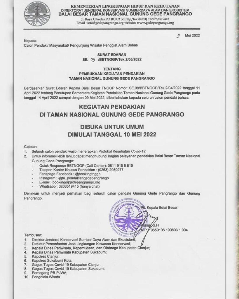 Humas BBTNGGP Agus Deni menjelaskan bahwa Surat tersebut mengenai Kegiatan Pendakian Taman Nasional Gunung Gede Pangrango. Pada 14 April 2022 sampai dengan 09 Mei 2022 telah dibuka dengan syarat dan ketentuan khusus.