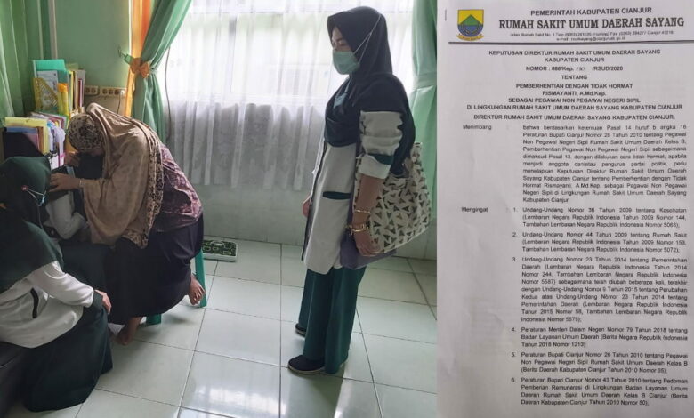 CIANJURUPDATE.COM, Cianjur – Rismayanti, seorang perawat non-PNS di RSUD Cianjur diberhentikan atau dipecat tidak hormat secara mendadak. Alasannya, ia dituduh menjadi anggota atau pengurus partai politik (parpol).