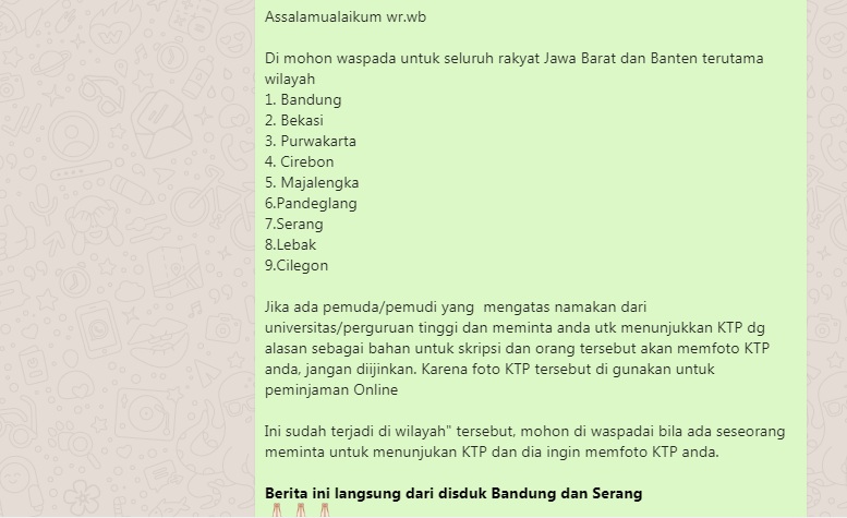 Pesan hoaks tersebut berisi imbauan kepada seluruh masyarakat Jawa Barat dan Banten tentang adanya penipuan. Modus yang disebutkan dalam pesan hoaks itu ialah pemuda yang mengatasnamakan suatu perguruan tinggi dan meminta foto KTP untuk melakukan pinjaman online.