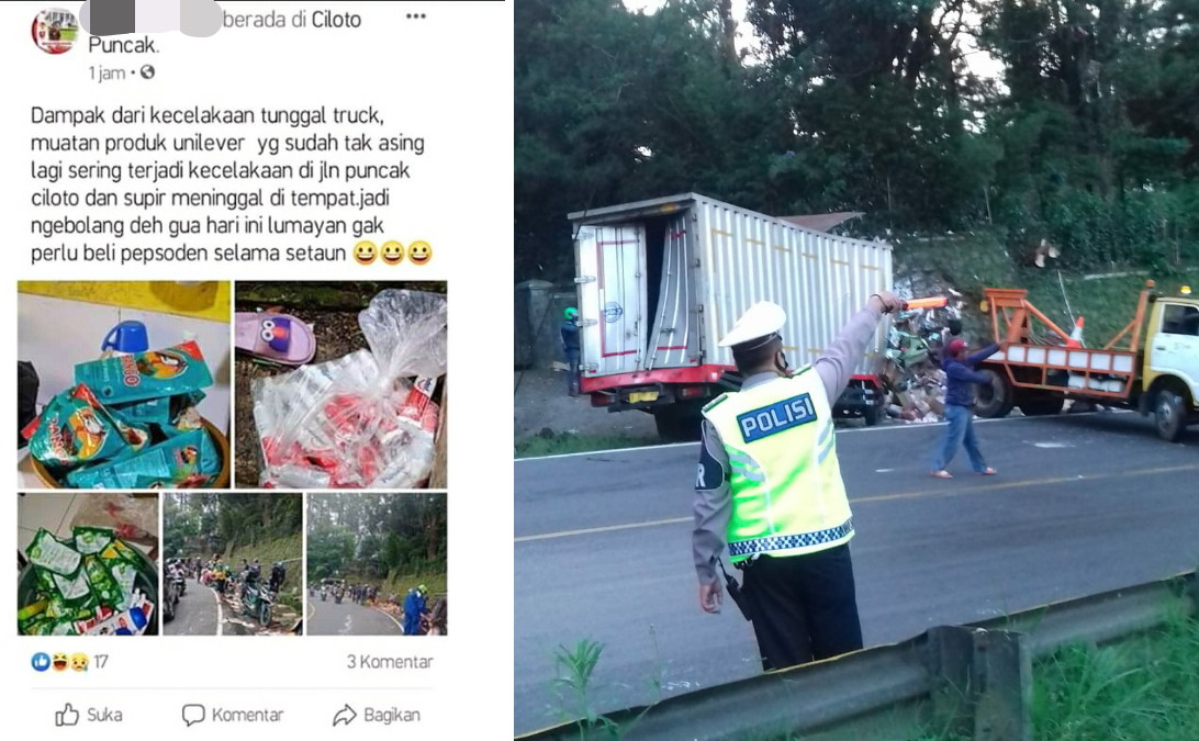 Diketahui, akun Facebook berinisial AS viral karena mengunggah foto sejumlah barang diduga diambil truk yang mengalami kecelakaan di Jalur Puncak, Desa Ciloto, Kecamatan Cipanas, Kabupaten Cianjur. Sontak hal itu pun ramai diperbincangan di sosial media Facebook.