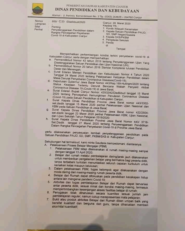 Surat itu ditujukkan kordik wilayah kecamatan, kepala satuan pendidikan PAUD, SD, SMP negeri dan swasta. Lalu, kepala SKB dan PKBM, dan penilik. Keputusan itu pun ditetapkan sebagai upaya pencegahan penyebaran virus corona atau Covid-19 di lingkungan pendidikan di Kabupaten Cianjur.