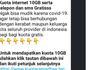 CIANJURUPDATE.COM – Baru-baru ini beredar kembali pesan berantai di aplikasi pesan WhatsApp yang berisi link terkait kuota gratis 10 GB…