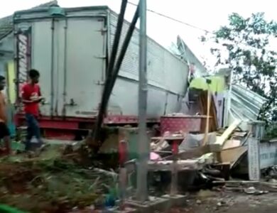 Diduga Alami Rem Blong, Truk Kontainer Hantam Truk dan Bangunan di Jalur Bangbayang Gekbrong