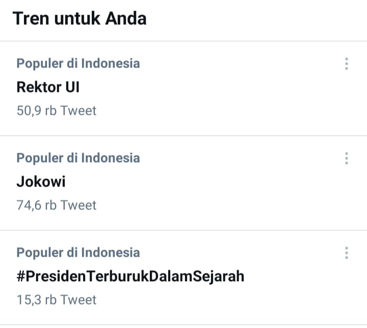 CIANJURUPDATE.COM, Jakarta – Pagi ini, Rabu (21/7/2021) tagar ‘Presiden Terburuk Dalam Sejarah’ dan kata kunci ‘Rektor UI’ menjadi trending topic teratas di media sosial Twitter.