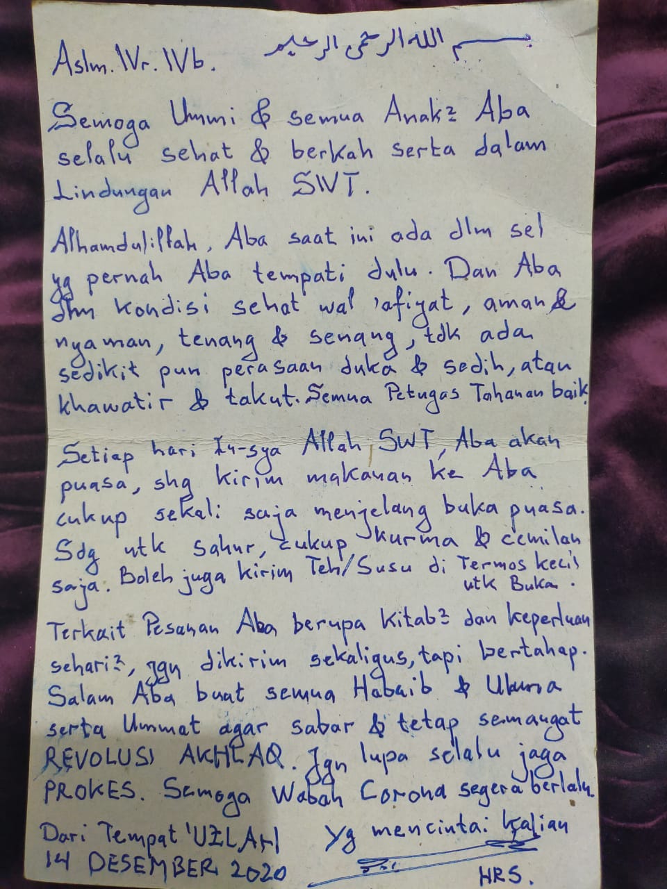 “Alhamdulillah, aba (Rizieq Shihab) saat ini ada dalam sel yang pernah aba tempati dulu dan aba dalam kondisi sehat wal’afiat,” kata Rizieq dalam suratnya, dikutip Selasa (15/12/2020).