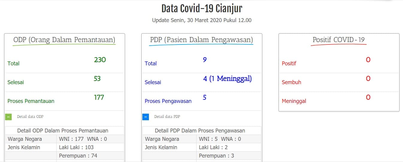 Data tersebut meningkat dari data sebelumnya yang Cianjur Update rangkum dari laman covid-19.cianjurkab.go.id. Sebelumnya, ODP di Kabupaten Cianjur ada 149 ODP yang masih dalam proses. Selain itu, ada 48 ODP yang telah dianggap selesai. Dengan demikian, sebelumnya total ada 197 ODP di Kabupaten Cianjur.