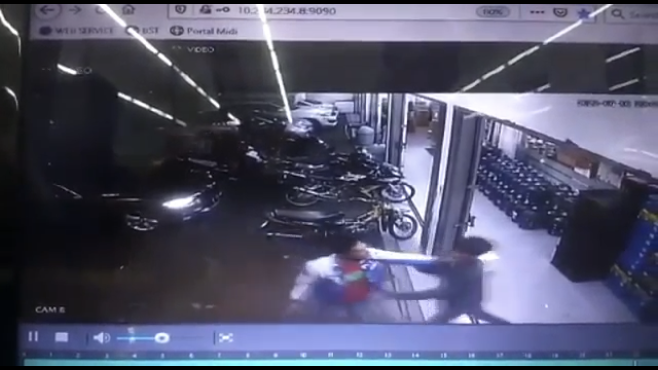 Video itu diawali dengan seorang pengunjung berpakian hitam keluar dan melangkah menuju parkiran. Kemudian, seorang pria berjaket biru mendatangi pria tersebut disusul dengan beberapa sekelompok pemotor lainnya.