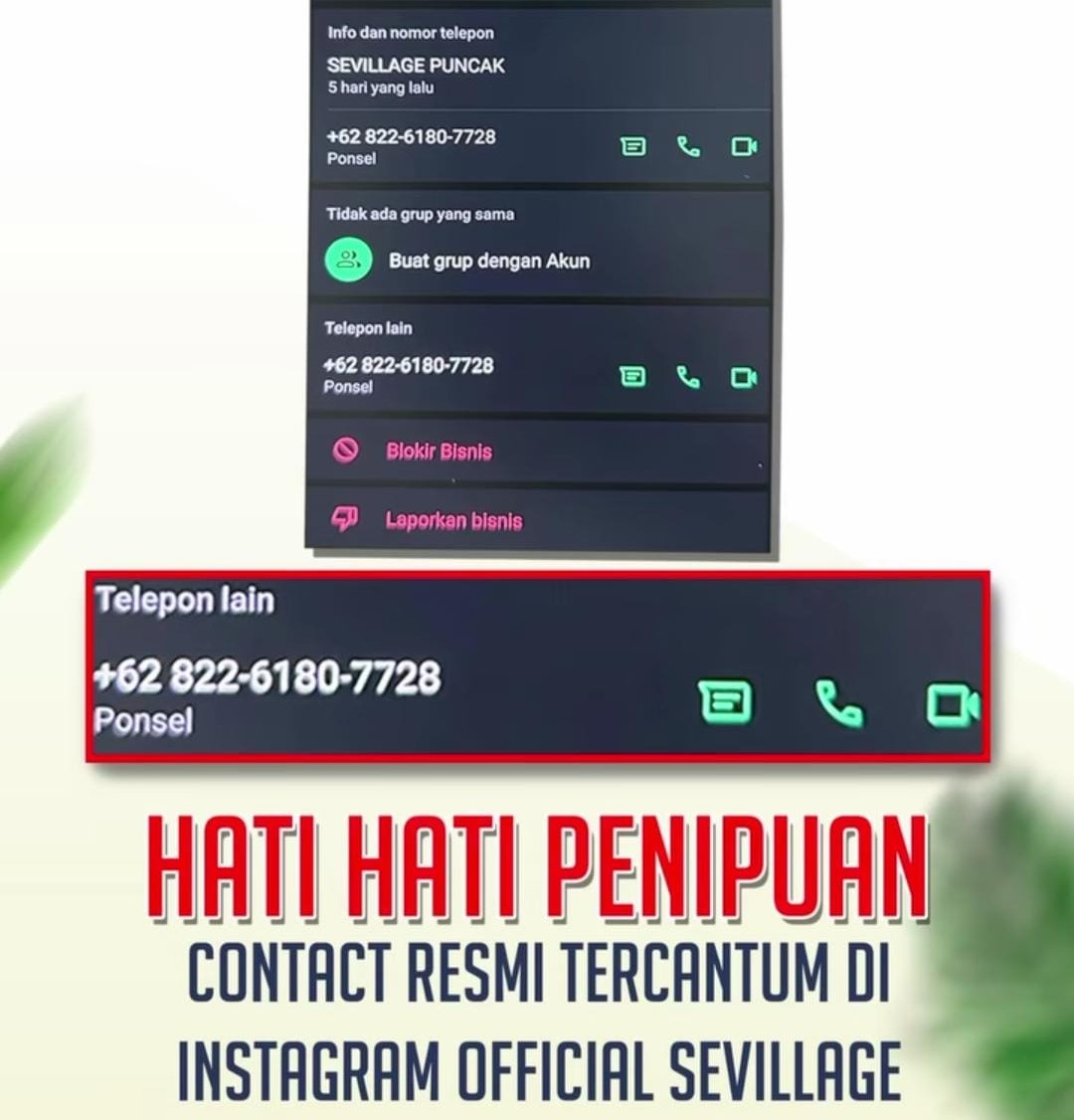 Verifikasi Kontak Resmi: Selalu pastikan nomor pemesanan yang dihubungi HANYA berasal dari website resmi Sevillage dan akun official media sosial Sevillage. Aturan Transfer Krusial: Jangan pernah melakukan transfer ke rekening pribadi atas nama siapa pun.